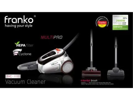 მახასიათებლები: ბრენდი: FRANKO მოდელი: FVC-1111 ტიპი: სტანდარტული მართვა: მექანიკური კორპუსიდან მტვრის შეგროვება: კონტეინერი ფილტრი : HEPA მილი: ტელესკოპური სამოძრაო რადიუსი: