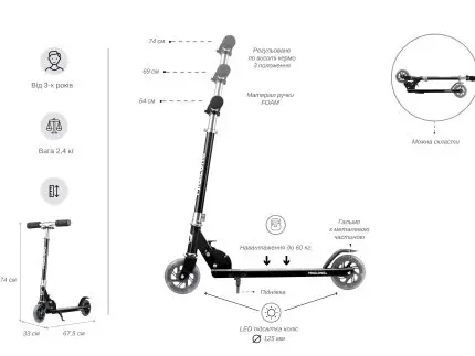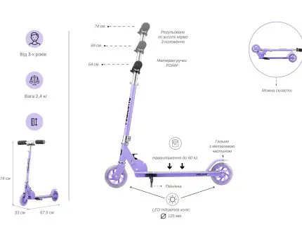 ტექნიკური მახასიათებლები: ტიპი: სამბორბლიანი სკუტერი ასაკი: 3-დან 10 წლამდე მაქს. დატვირთვა: 50 კგ საჭის სიმაღლე: 62.5 / 75 / 80